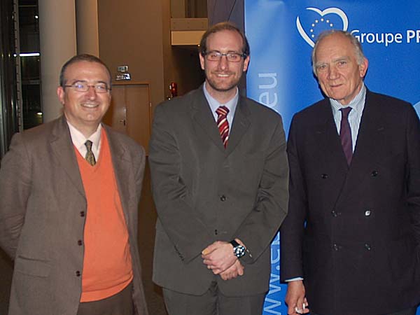 "En el centro, Antoine Mellado, delegado de The Family Watch en Bruselas, junto a otros participantes en el acto."