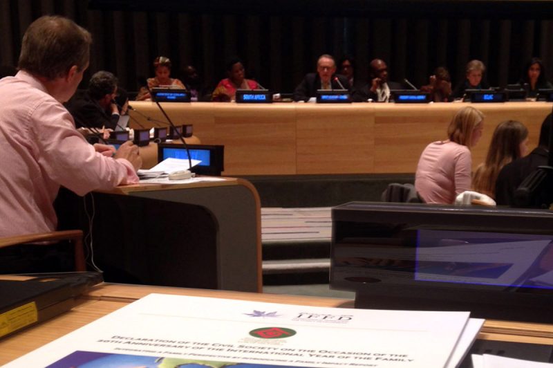 Durante la apertura del periodo de sesiones nº 68 de la Asamblea General de Naciones Unidas, que ha tenido lugar del 20 al 27 de septiembre de 2013, dos delegados de The Family Watch han podido representar a la International Federation for Family Development en varias reuniones de especial trascendencia, dirigidas a la definición de los próximos Objetivos de Desarrollo, que sucederán a los del Milenio y estarán en vigor a partir de 2015, además de asistir a distintos eventos a los que la Federación había sido invitada.Al abogar por el reconocimiento del papel de la familia en los nuevos Objetivos de Desarrollo, ambos han podido difundir entre una veintena de los jefes de Estado y de Gobierno, así como otros representantes de gobiernos u organismos internacionales y ONGs, la Declaración de la Sociedad Civil con ocasión del XX Aniversario del Año Internacional de la Familia y la conveniencia de celebrarlo.