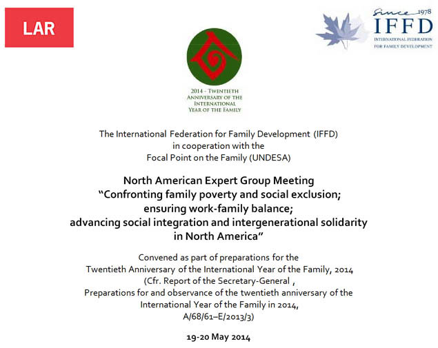 The Family Watch se ha encargado, como miembro de la International Federation for Family Development, de organizar el Encuentro del Grupo de Expertos Norteamericanos que ha tenido lugar en México D. F. los días 19 y 20 de mayo como parte de las celebraciones del XX Aniversario del Año Internacional de la Familia. Académicos y representantes de la sociedad civil ha debatido sobre las propuestas de recomendaciones de políticas sociales que deberían promoverse desde Naciones Unidas. Toda la documentación se publicará y las conclusiones finales han sido recogidas para su utilización en el Informe que el Secretario General presentará con ocasión de ese aniversario y que incluirá las recomendaciones de la Asamblea General a los Estados miembros. </B><BR/> <BR/>El principal objetivo ha sido proporcionar a los Estados Miembros de Naciones Unidas y otros actores interesados la opinión de expertos y sus recomendaciones sobre los tres temas sugeridos para este Aniversario. Para ello, se ha invitado a expertos que se ocupan de diversos temas relacionados con políticas familiares provenientes de distintos lugares, en reconocimiento a su prestigio. <BR/> <BR/>A todos ellos se les ha pedido que aporten un documento de trabajo sobre uno de los temas y que participaran en los debates con su opinión de expertos y sus recomendaciones sobre la mejor forma de integrar la perspectiva de familia en la elaboración y desarrollo de nuevas políticas, así como la elaboración de recomendaciones específicas y la transmisión de ejemplos y buenas prácticas en las tres áreas mencionadas.