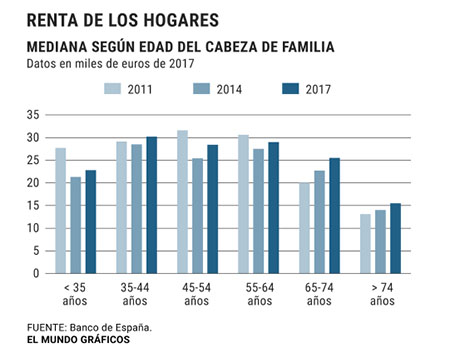 Así lo evidencia la Encuesta de Financiera de las Familias (EFF) que ayer presentó el Banco de España, con datos relativos a 2017, y en la que se constata que los jubilados han sorteado mejor que nadie la crisis por la llegada a ese grupo de edad de trabajadores con mejores carreras profesionales pero, por supuesto, gracias también a que las pensiones no han tenido que hacer frente a la fuerte moderación que sí sufrieron los salarios.