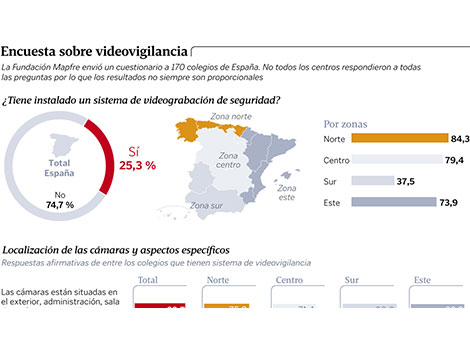 Uno de cada cuatro colegios de España tiene ya videovigilancia y el 9% captan zonas sensibles, según un estudio.